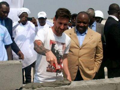阿里·邦戈總統(tǒng)和里奧·梅西先生先后在基石上砌下第一塊磚,并在石膏板上按下了手印。